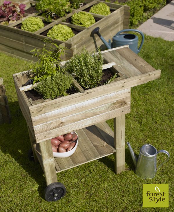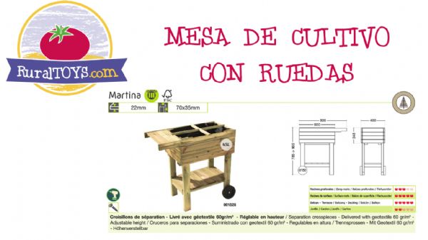 Mesa de cultivo con ruedas Martina, de madera y con geotextil 60gr/m2 incluido.